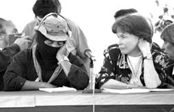 Corre en reversa el videoteip. A las 9:30 de la mañana aparece junto a la valla de San Andrés madame Mitterrand, que no sabe todavía la que va a armar. Pasa a la sede del diálogo en San Andrés, conversa relajadamente con algunos asesores zapatistas, mientras la reciben los comandantes. Están por iniciarse la reunión plenaria de los negociantes. A las 10:30 los zapatistas solicitan un receso para recibir a la visitante de la fundación France Liberté. Antes de las 11 de la mañana, doña Danielle coincide accidentalmente en la sala de junta con Marco Antonio Bernal, Jorge del Valle, toda la Cocopa, la Conai, la delegación zapatista y los asesores.