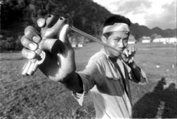 Un indígena chol muestra la orqueta que usa para pajarear.