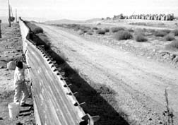 Migrantes limpian el muro metálico fronterizo, frente a donde se