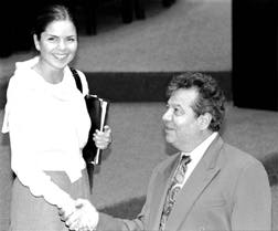 Porfirio Muñoz Ledo felicita a Gloria Lavara, del PVEM, quien fue