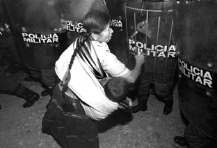 Una indígena intenta impedir el paso de