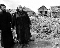 Serbios observan en Surdulica los daños causados a sus viviendas por la aviación de la OTAN, que nuevamente se equivocó de objetivo. n Foto: Ap