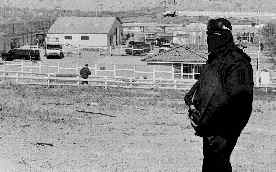 Un agente de la Procuraduría General de la República vigila el campo de tiro Paso del Norte, en el kilómetro 4.5 de la carretera a Casas Grandes, donde personal de la PGR, la FBI y el Ejército Mexicano buscan un cementerio en el que al parecer los narcos sepultaban a sus víctimas Ť Foto: Tomás Bravo