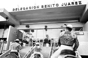 La oposición de la empresa a acatar el reglamento taurino para permitir el examen post-mortem de las reses obligó al juez de la Plaza de Toros México, Salvador Ochoa, a cancelar el espectáculo. Ante ello, alternantes, picadores, banderilleros y monosabios se trasladaron a la delegación para protestar por la decisión de las autoridades Ť Foto: Arturo Guerra