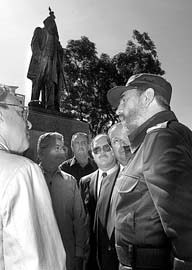 Fidel Castro se presentó de manera sorpresiva en la ceremonia de develación de la estatua del Benemérito de las Américas, que donaron senadores priístas. En torno a los futuros vínculos entre México y Cuba, respondió: ``Fox ha dicho que trabajará por el desarrollo de las relaciones y yo lo creo'' Ť Foto: Ap