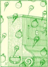 Él dijo que prefería dejarlo enfriar un poco, se levantó y se acercó al árbol. Ella también se levantó y comenzó a explicarle algo en relación con las luces intermitentes, después de lo cual se arrodilló en el suelo y empezó a sacar las esferas de las cajitas.