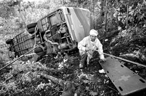 Una camioneta de la oficina del comisionado para la paz, Luis H. Alvarez, invadió el carril contrario y provocó que un autobús cayera a un barranco en la carretera que va de Tuxtla Gutiérrez a San Cristóbal de las Casas. Hubo además 20 heridos FOTO VICTOR M. CAMACHO