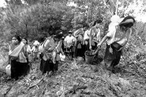 Un grupo de indígenas desplazadas de la comunidad de Yibeljo, municipio de Chenalhó, busca leña rumbo al campamento de Xoyep FOTO VICTOR M. CAMACHO