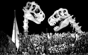 Aguilera y Willie Nelson. Abajo, dos dinosaurios gigantes se elevan sobre