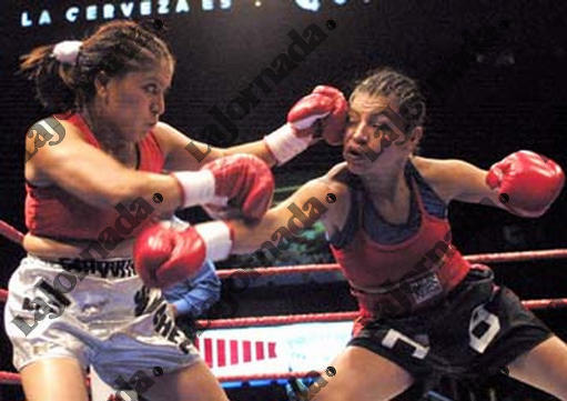 | Elizabeth Chiquita Sanchez conecta un izquierdazo a Andres Nena Benitez en la pelea por el primer campeonatofemenil nacional en la historia del boxeo mexicano, donde Sanchez se corono campeona, el 15 de junio del 2002. LA JORNADA/ Jose Carlo Gonzalez |