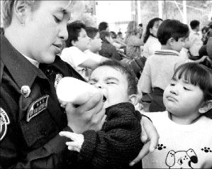 DOBLE MERITO  Una agente con sus hijos, durante la entrega de reconocimientos a la labor policial en la delegación Iztapalapa, encabezada por el titular de Seguridad Pública, Marcelo Ebrard FOTO CARLOS CISNEROS