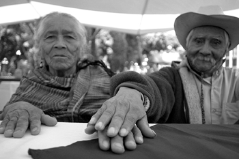 Una pareja de ancianos en el zócalo de la capital