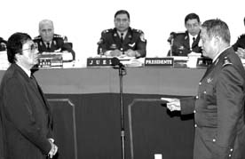 El ex comandante de la Policía Judicial Federal, Adrián Carrera Fuentes, escucha los reclamos del general Arturo Acosta Chaparro durante el careo que solicitó este último con el testigo protegido: ``dos veces el señor pretendió presentarme a una persona, de la cual ignoraba su nombre (se trataba de Amado Carrillo)'', dijo el militar. El ex jefe policiaco contestó: ``pues yo no recuerdo; ha pasado mucho tiempo'' FOTO MARCO PELAEZ