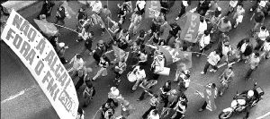Estudiantes marchan con banderas y gritando consignas durante una protesta por el centro financiero de Sao Paulo, Brasil, contra la creación del ALCA FOTO AFP