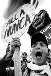 Un manifestante grita consignas durante una protesta contra la reunion ministerial del ALCA (Area de Libre Comercio de las Américas), en Quito. Organizaciones sociales e indígenas de Ecuador realizarán una campaña nacional de lucha contra el ALCA, "acuerdo comercial que pretende implantar Estados Unidos" FOTO AFP