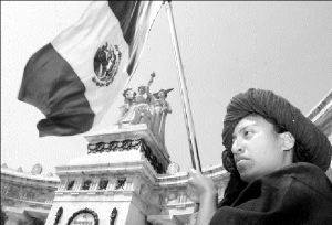 Estudiantes de la Escuela Nacional de Antropología e Historia junto con indígenas totonacas marcharon ayer en Papantla contra la Cumbre Tajín 2003 y la invasión estadunidense en Irak FOTO CRISTINA RODRIGUEZ