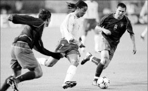 El brasileño Ronaldinho Gaucho fue bien controlado por la defensa portuguesa FOTO