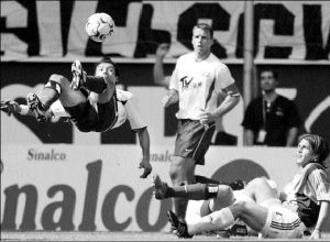 El argentino Rodolfo Cardoso, del Hamburgo, realiza una chilena frente a la portería del Leverkusen, en el triunfo de su equipo por categórico 4-1 FOTO AFP