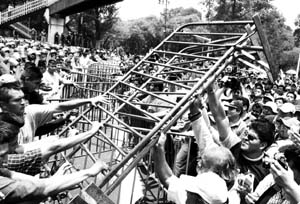 Integrantes de la Coordinadora Nacional de Trabajadores de la Educación luchan por remover las vallas para continuar su marcha hacia Los Pinos, en donde se realizaba la ceremonia oficial por el Día del Maestro. Los manifestantes lograron traspasar dos retenes antes de ser contenidos por los granaderos FOTO JESUS VILLASECA