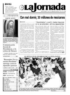 El escritor, al hacer una justificación social de la poesía, explicó que "un rasgo común entre un joven europeo que ataca con bombas incendiarias un campamento de refugiados y el muchacho que asalta y viola en los microbuses de esta cada vez más áspera ciudad" es que "son incapaces de ponerse en el lugar de los demás", porque sin "la oportunidad de leer, su imaginación y su sensibilidad quedaron muertas". El acto se realizó en el auditorio Jaime Torres Bodet del Museo de Antropología y asistió el presidente Vicente Fox FOTO ALFREDO DOMINGUEZ