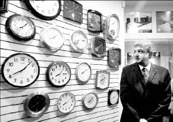 sostiene un reloj con números en desorden, porque "cada quien tiene