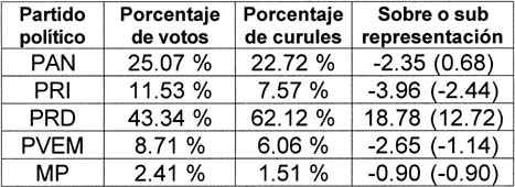 De ese modo, la sobrerrepresentación del PRD -que era de 12.72 puntos porcentuales con los 37 diputados que ganó por mayoría- sube a 18.78 puntos porcentuales, mientras la subrepresentación de los demás partidos (excepto México Posible, que no se altera) también aumenta, como se observa en el siguiente cuadro, donde se incluyen entre paréntesis los porcentajes de sobre o subrepresentación anteriores, es decir, los que se derivaron de la asignación original hecha por el Instituto Electoral del Distrito Federal (IEDF):