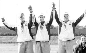 Los mexicanos René Serrano, Luis Eduardo Velez y Jorge Pablo Chapoy festejan su medalla de plata lograda en tiro con arco FOTO REUTERS