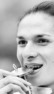La sonorense da una probadita a la medalla en la ceremonia que la acredita como la monarca de los 400 metros planos del Campeonato Mundial de Atletismo París 2003 FOTO REUTERS