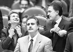 Elba Esther Gordillo, dirigente de la bancada priísta en San Lázaro, festeja la confirmación de Luis Carlos Ugalde en la presidencia del Consejo General de Instituto Federal Electoral para un periodo de siete años. Miguel Angel Yunes la observa. Al centro, Homero Díaz FOTO FRANCISCO OLVERA