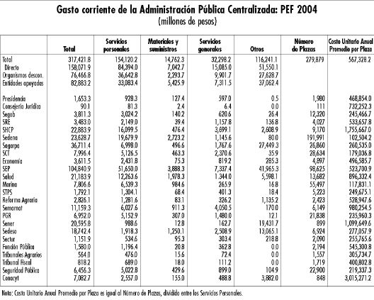 El gasto corriente de la administración pública centralizada (APC) para 2004 será de 317 mil 421 millones de pesos, y se concentrará principalmente en el pago de servicios personales, cuyo monto ascenderá a 154 mil 120 millones de pesos, 48.5 por ciento de las erogaciones totales en ese rubro, que corresponden al pago de 279 mil 879 plazas, que costarán en promedio 567 mil 328 pesos.