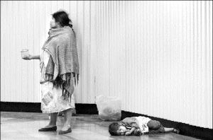 Una mujer con su hija pide limosna en la estación Hidalgo del Metro