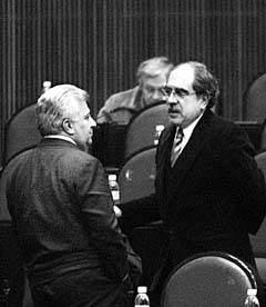 "¿En qué quedamos?", preguntó el perredista Pablo Gómez (derecha) al priísta Emilio Chuayffet. "En nada -respondió-. Te ofrecí mi voto y ahí está. Pero no puedo comprometer el de 220 diputados" FOTO JESUS VILLASECA
