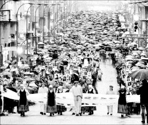 EXIGEN VASCOS LA LIBERACION DE PRESOS POLITICOS  Decenas de miles de personas se manifestaron en Bilbao para pedir la repatriación de presos vascos, recluidos en penales de toda España por política de Madrid, en una marcha convocada tras el proceso de reflexión efectuado en el ámbito de los movimientos pro amnistía vascos. La manifestación concluyó con un acto político frente al consistorio de la ciudad, en el que el ex preso político Enrique Letona afirmó: "Es Euskal Herria como pueblo quien está preso", y aseguró que la resolución del conflicto vasco no se logrará mientras no haya amnistía para todos los prisioneros originarios de la región FOTO AFP
