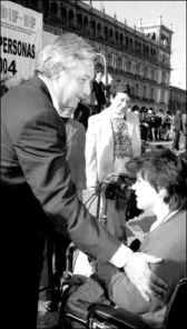 NUEVOS BENEFICIARIOS  El jefe de Gobierno, Andrés Manuel López Obrador, entregó ayer mil 500 becas a nuevos beneficiarios del Programa de Apoyo a Personas con Discapacidad, en la explanada del Zócalo FOTO CHALAO RAMIREZ
