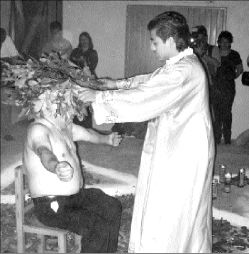 la cabeza, el brujo derrama la sangre del sacrificio sobre una hoguera