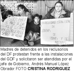 Madres de internos en los distintos reclusorios de la ciudad se manifestaron ayer frente a las oficinas del jefe de Gobierno del Distrito Federal para exigir que se acabe con los abusos y la corrupción que impera en los penales, debido al tráfico de droga y el cobro de cualquier trámite, incluso el pase de lista.