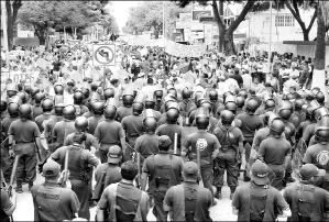 FRENTE A FRENTE  Granaderos impiden el paso a manifestantes a la sede de la reunión de la Conago en Villahermosa FOTO LA VERDAD DEL SURESTE