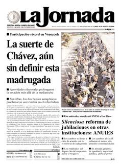 Caracas, lunes 16 de agosto. Los venezolanos tomaron las urnas por asalto y, en el marco de una participación histórica, obligaron a que las autoridades electorales pospusieran en dos ocasiones el cierre de los lugares de votación. En la madrugada de este lunes, los votantes aún hacían fila para sufragar. Mientras tanto, en los cuarteles generales del oficialismo y de la oposición cada uno se atribuía el triunfo. La agencia de noticias inglesa Reuters, en un despacho urgente, daba cuenta en la madrugada, citando fuentes oficialistas, de que el resultado favorecía al chavismo, versión que minutos después fue confirmada por una fuente oficial. El ex presidente de Estados Unidos, James Carter, presente en la histórica jornada, destacaba la amplia participación ciudadana en el referéndum revocatorio, en tanto que el colombiano César Gaviria, secretario general de la Organización de Estados Americanos (OEA), se rindió ante el "civismo extraordinario" que primó en los comicios. El presidente Hugo Chávez convocó a los medios de prensa para que acudieran al Palacio de Miraflores, ya en la madrugada, mientras sus simpatizantes recorrían las calles caraqueñas, en caravana, celebrando su victoria. La oposición, más cauta, convocaba a celebrar en su cuartel general. Pese a que el oficialismo se mostraba seguro de ganar con holgura, los ríos de gente en las calles animaban la apuesta opositora en el "voto oculto" de los indecisos o de quienes temían revelar su intención de voto en las encuestas. En la madrugada, tras visitar el Consejo Nacional Electoral, Carter declaró, confiado, que ``el resultado de las elecciones será mucho más satisfactorio de lo que fue en Florida en el año 2000''.