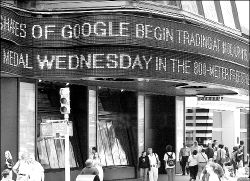 GOOGLE ENTRO AL NASDAQ  El tablero electrónico de los estudios de ABC News da cuenta de la entrada de Google al mercado tecnológico Nasdaq. Las acciones de Google Inc subían más de 18 por ciento, a 100 dólares, cuando el precio inicial era de 85 dólares FOTO AFP
