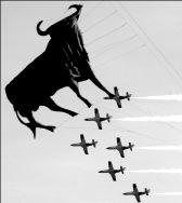 ACROBACIAS  El grupo español de vuelo acrobático Patrulla Aguila muestra sus habilidades cerca de un papalote con forma de toro, durante el Festival de la Aeronáutica, que se celebra a inicios de octubre en las playas de Barcelona en honor a La Mercé, santa patrona de la ciudad catalana FOTO REUTERS