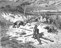 Ilustraci�e Dor�En el cap�lo 15 de la primera parte del Qujote, Miguel de Cervantes Saavedra escribe: Don Quijote ?ech�no a su espada y arremeti�los gallegos, y lo mesmo hizo Sancho Panza, incitado y movido del ejemplo de su amo. Y, a las primeras, dio don Quijote una cuchillada a uno, que le abri� sayo de cuero de que ven�vestido, con gran parte de la espalda. Los gallegos, que se vieron maltratar de aquellos dos hombres solos, siendo ellos tantos, acudieron a sus estacas, y, cogiendo a los dos en medio, comenzaron a menudear sobre ellos con grande ah�o y vehemencia. Verdad es que al segundo toque dieron con Sancho en el suelo, y lo mesmo le avino a don Quijote, sin que le valiese su destreza y buen �mo; y quiso su ventura que viniese a caer a los pies de Rocinante, que a� se hab�levantado?