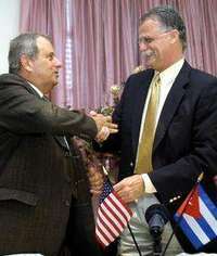 El presidente de la empresa cubana Alimport, Pedro Alvarez, en un encuentro con Donald Allee, director ejecutivo del puerto de Gulport, de Mississippi, ayer en La Habana FOTO Notimex