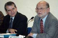 Jaime Parada Avila, director del Conacyt, y Jos�arukh� coordinador de la Conabio, durante la presentaci�el libro Colecciones biol�as FOTO Notimex/Jos�uis Salmer�