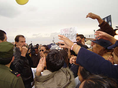 Con gritos de "¡no al desafuero!", el Presidente fue recibido por un grupo de perredistas durante su gira por Chicoloapan, estado de México, para la entrega de viviendas de interés social a burócratas. El jefe del Ejecutivo les respondió que sus pancartas "las llevaran al juez y a los diputados". Antes, en un encuentro con la Concamin, el mandatario reanudó críticas contra programas sociales que se aplican en la ciudad de México, al afirmar que no es posible atender promesas de apoyo a personas de la tercera edad y de pensiones y jubilaciones a funcionarios y trabajadores del sector público "sin ingresos sostenibles " Foto RENE RAMON ALVARADO