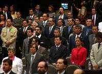Emilio Chuayffet, del PRI, y Pablo G�, del PRD, entre otros, durante la sesi�egislativa FOTO Francisco Olvera