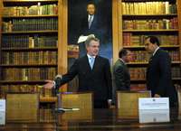 El secretario de Gobernaci�Santiago Creel Miranda, aparece con el gobernador de Michoac� L�ro C�enas. Ayer, en Bucareli, ambos firmaron un convenio de colaboraci�n materia de inteligencia y seguridad nacional FOTO Roberto Garc�Ortiz