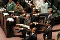 Toluca, Mex. 24 de mayo. A 12 días de que empezó el escándalo de corrupción en el Instituto Electoral del Estado de México (IEEM), esta noche rindieron protesta los integrantes del nuevo Consejo General del organismo ante el Congreso local. Antes de asumir el cargo, el presidente del IEEM, José Núñez Castañeda, exigió a los tres niveles de gobierno no entrometerse en el proceso comicial.