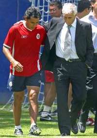 Jorge Ben�z, ex entrenador de Boca Juniors, dialog�n el entrenador de Chivas, Benjam�Galindo, durante el entrenamiento del equipo FOTO Reuters