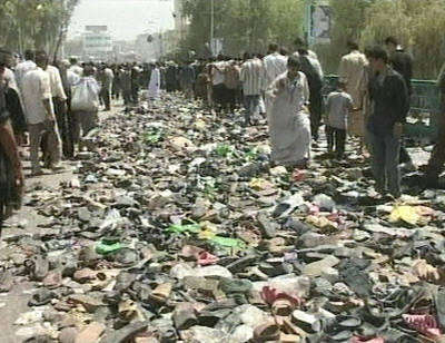 Zapatos y escombros quedaron regados en un puente de la capital iraquí luego de que una muchedumbre corrió despavorida ante una falsa alarma de ataque suicida. El pánico aumentó cuando soldados dispararon al aire. Todo se originó por detonaciones de morteros cerca de la procesión chiíta, lo que hizo temer una agresión. Gran parte de las víctimas son mujeres y niños, que cayeron al río Tigris y se ahogaron. Al menos un millón de fieles se dirigían hacia la mezquita de Qadimiya cuando la multitud echó a correr