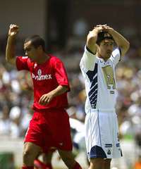 Ampliar la imagen Mientras Edgar Due� del Toluca, celebra la anotaci�el puma Marioni se lamenta FOTO Ap Foto: Ap